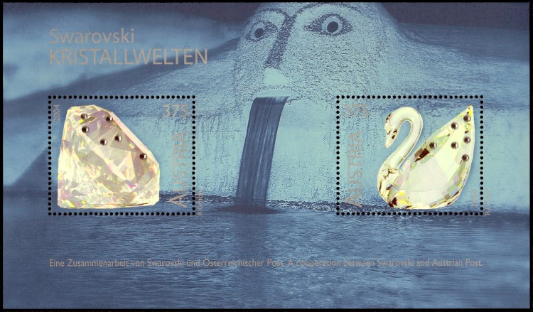 Kristallblock und Schwan mit jeweils 6 aufgeklebten Swarovski-Kristallen, im Hintergrund der Riese - Eingang zu den Swarovski Kristallwelten in Wattens |