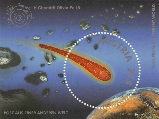 aufgedruckter Original-Meteoritenstaub aus der Olivin-Mischkristallreihe Forsterit - Fayalit |