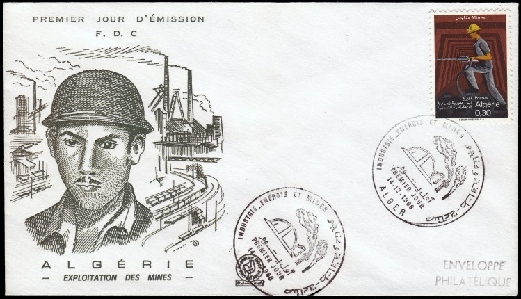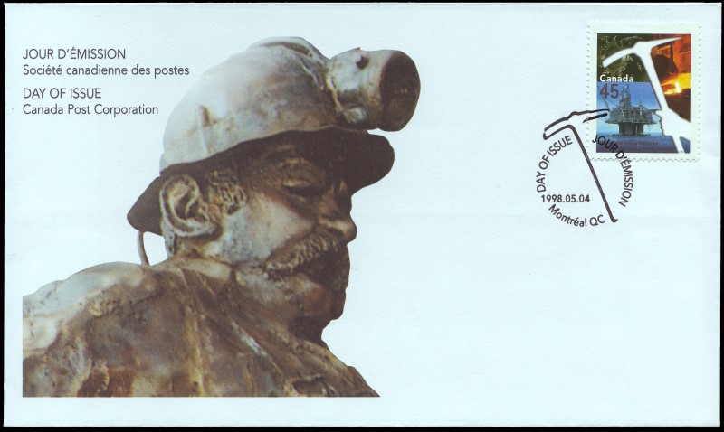 Ersttagsbrief – “Mineral- und Energie-Industrie“ Das Briefmarkenmotiv zeigt eine Erdölplattform, einen Schmelztiegel und ein Schaufelrad. Im Vordergrund ist die Silhouette einer Hacke ab- gebildet. Auf dem Umschlagmotiv ist die Büste eines Bergmannes mit Helm und Kopflampe zu sehen. Der Ersttagsstempel enthält eine Hacke. Entwertet in Montreal, Canada - 1998 |