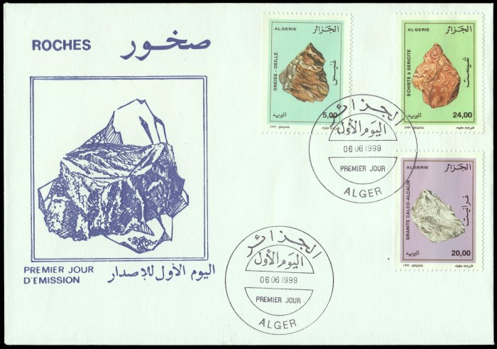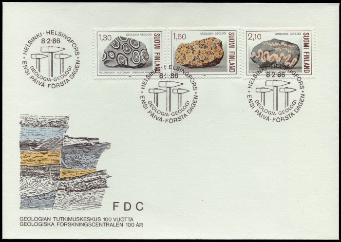 Ersttagsbrief - "100 Jahre Geologische Forschungsstelle" Das Umschlagmotiv stellt die unterschiedlichen Gesteinsschichten dar, auf den Briefmarken abgebildet sind 1.30 Orbicular-Granit, 1.60 Rapakiwi-Granit und 2.10 gebänderter Gneis, im Ersttagsstempel Geologenhämmer und der Hinweis Geologische Erdgeschichte. Entwertet in Helsinki, Finnland - 1986 |