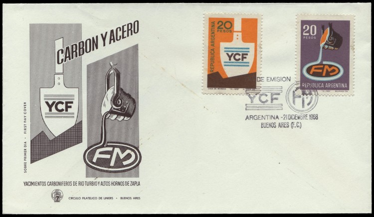 Ersttagsbrief - "Kohle und Stahl - Staatliche Kohlenbergwerke von Rio Turbio und Hüttenwerke von Zapla, Provinz Jujuy" Die 20 Pesos Briefmarken zeigen eine Schaufel mit dem Emblem der Yacimientos Carboniferos Fiscales (YCF) und einen Schmelztiegel mit dem Emblem der Fábricas Militares (FM). Das Schmuckmotiv des Briefumschlages zeigt die gleichen Motive. Im Ersttagsstempel sind ebenfalls die Logos der beiden Gesellschaften enthalten. Entwertet in Buenos Aires, Argentinien - 1968 |