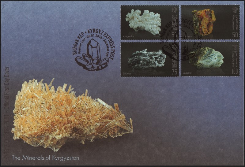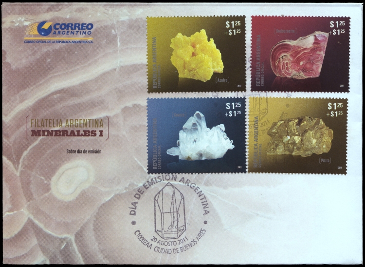 Ersttagsbrief “Mineralien I“ Der Ersttagsbrief ist frankiert mit dem Satz Mineralien I und zeigt auf vier Briefmarken mit jeweils gleichem Wert die Mineralien Schwefel, Rhodochrosit, Quarz in der Varietät Bergkristall und Pyrit. Der Briefumschlag ist in der Struktur des auf der Briefmarke abgebildeten Rhodochrosit eingefärbt und enthält neben der Aufschrift Philatelie Argentinien – Mineralien I das Logo der argentinischen Post. Der Ersttagsstempel zeigt einen Quarzkristall. Entwertet in Buenos Aires, Argentinien - 2011 |