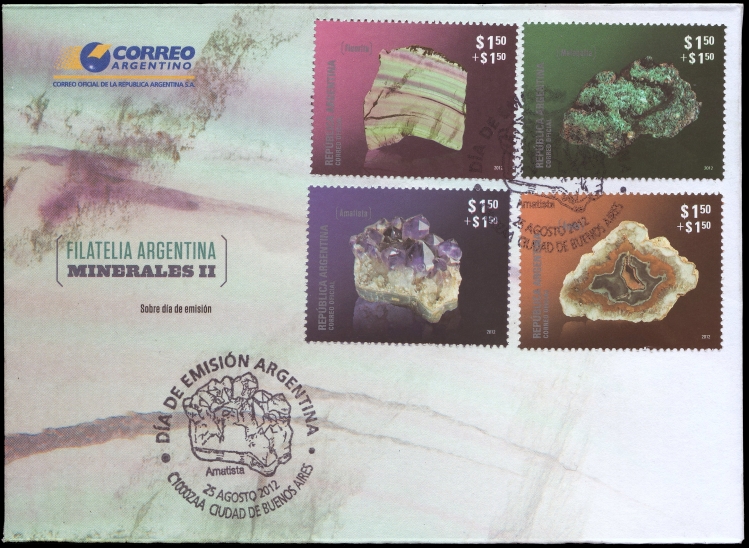 Ersttagsbrief “Mineralien II“ Der Ersttagsbrief ist frankiert mit dem Satz Mineralien II und zeigt auf vier Briefmarken mit jeweils gleichem Wert die Mineralien Fluorit, Malachit, Quarz in der Varietät Amethyst und Achat. Der Briefumschlag ist in der Struktur des auf der Briefmarke abgebildeten Fluorits eingefärbt und enthält neben der Aufschrift Philatelie Argentinien – Mineralien II das Logo der argentinischen Post. Der Ersttagsstempel zeigt eine Zeichnung der auf der Briefmarke abgebildeten Amethyststufe. Entwertet in Buenos Aires, Argentinien - 2012 |