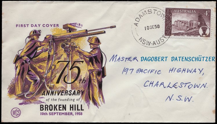 Tatsächlich gelaufener Ersttagsbrief - “75. Jahrestag der Gründung von Broken Hill“ Der Brief ist frankiert mit einer 4.D Marke welche Bergbauanlagen von Broken Hill zeigen. Am rechten unteren Rand ist eine Erz- Lore abgebildet. Am linken Markenrand sind Zeichnungen der Aborigines zu sehen. Das Motiv des Briefumschlages zeigt zwei Bergmänner mitelektrischen Kopflampen an einem Bohrgerät bei der Vorbereitung von Bohrlöchern für Sprengladungen. Entwertet in Adamstown, Australien - 1958 |