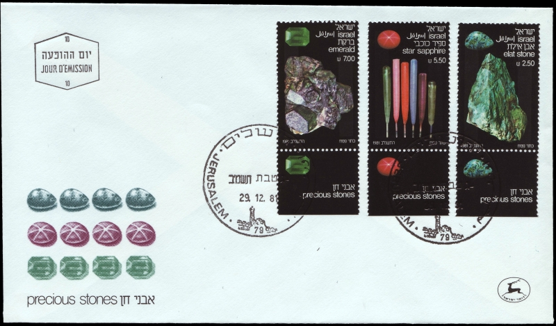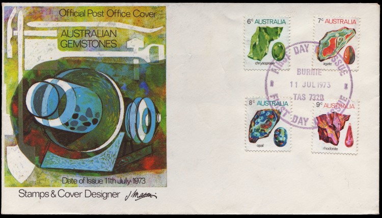 Ersttagsbrief - "Australische Edelsteine" Auf den Briefmarken abgebildet sind die Mineralien 6c Chrysopras, 7c Achat, 8c Opal und 9c Rhodonit jeweils naturbelassen und geschliffen. Das Schmuckmotiv des Briefumschlages zeigt typische Werkzeuge und Geräte der Edelsteinschürfer. Entwertet in Burnie, Australien - 1973 |