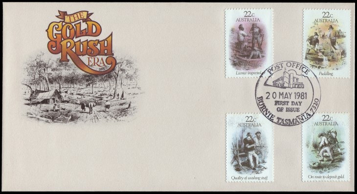Ersttagsbrief - "Die Goldrausch-Ära" Die Motive auf Briefmarken und Umschlag gehen auf den 1839 aus England ausgewanderten Maler Samuel Gill (1818 - 1880) zurück. Verarmt war er wie tausend andere beim Ansturm auf die 1851 entdeckten reichen Goldfelder Victorias dabei und hat mit seinen lebendigen Aufzeichnungen diese wilde Zeit festgehalten. Entwertet in Burnie, Australien - 1981 |