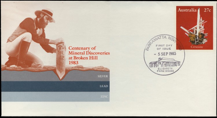 Ersttagsbrief - "100 Jahre Entdeckung der Blei-Zink-Silberlagerstätte Broken Hill" Das Umschlagmotiv zeigt die Pachtung/Claimabsteckung der Erzader durch Charles Rasp, einen deutschen Auswanderer und Entdecker der Lagerstätte. Auf der aufgedruckten Briefmarke ist eine Cerussit-Stufe von Broken Hill abgebildet. Entwertet in Parramatta, Australien - 1983 |