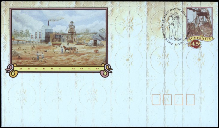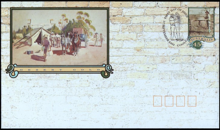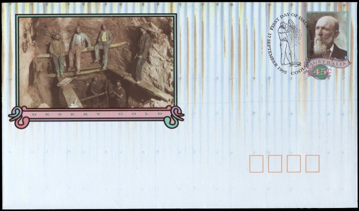 Ersttagsbrief III - "Gold-Wüste" Vom Umschlagmotiv wird angenommen, dass hier die Mine von Kanowna, die auch als "Weiße Feder" bekannt ist, dargestellt wird. Entwertet in Coolgardie, Australien - 1992 |