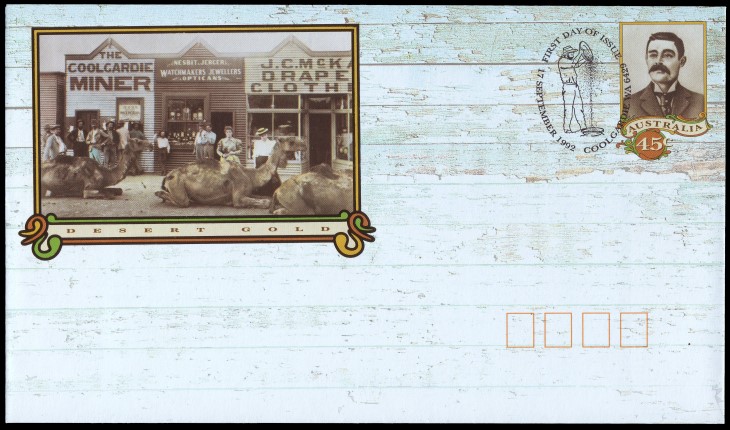 Ersttagsbrief II - "Gold-Wüste" Innerhalb weniger Monate entstand rund um Bayley's Claim eine Stadt. Für Tausende von Goldsuchern wurde Coolgardie zur Heimat. Das Umschlagmotiv zeigt Geschäfte, Zeitungsredaktion und Amtsgebäude, aus Leinwand und verzinktem Eisen erbaut. Entwertet in Coolgardie, Australien - 1992 |