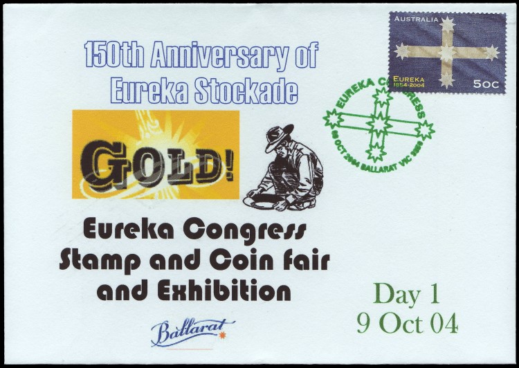 Ersttagsbrief - “ 150. Jahrestag der Eureka Stockade“ Auf der 50c Marke ist die Eureka-Stockade-Flagge abgebildet. Der Postsonderstempel zeigt ebenfalls ein entsprechendes Symbol. Das Umschlagmotiv zeigt einen Goldsucher mit Waschpfanne und die Aufschrift Gold, sowie einen Hinweis auf den Eureka-Kongress und eine Briefmarken- und Münzen-Ausstellung in Ballarat. Entwertet in Ballarat, Australien - 2004 |