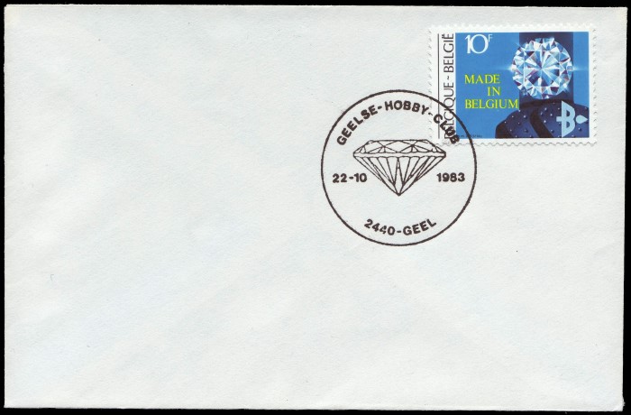 Briefumschlag mit einer 10F Briefmarke aus dem Satz Belgische Exportgüter. Das Motiv zeigt einen geschliffenen Diamanten sowie einen Bohrkopf. Im Postsonderstempel ist das Symbol eines Diamanten enthalten. Entwertet in Geel, Belgien - 1983 |
