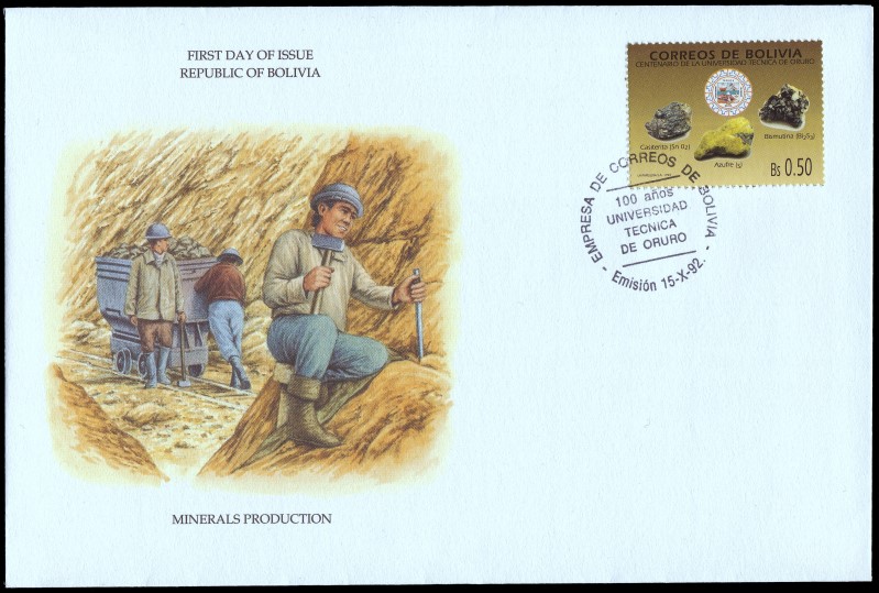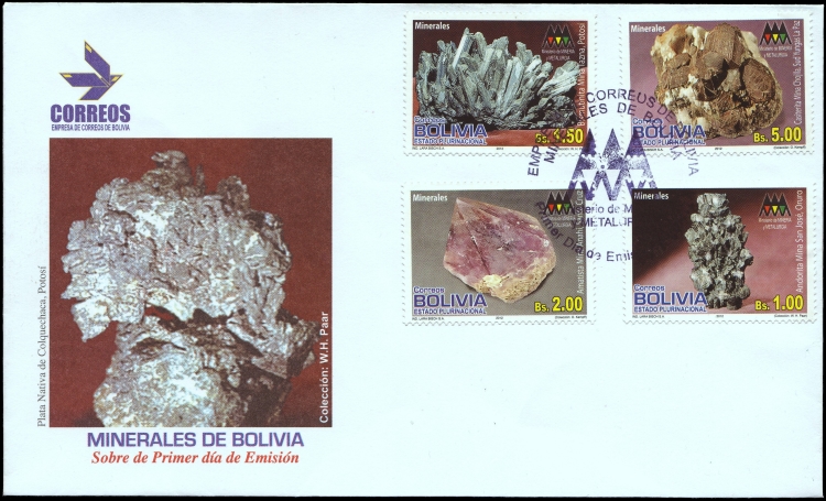 Ersttagsbrief "Mineralien aus Bolivien" Der Ersttagsbrief ist frankiert mit dem Satz Mineralien aus Bolivien. Die Motive der Briefmarken zeigen Andorit aus der Mine San José bei Oruro (1.00Bs), Bismuthinit aus der Mine Tazna bei Potosi (1.50Bs), Amethyst aus der Mine Anahi bei Santa Cruz (2.00Bs) und Kassiterit aus der Mine Chojlla, Süd Yungas La Paz (5.00Bs). Auf dem Umschlagmotiv Platin von Colquechaca, Potosi. Auf allen Marken ist rechts oben das Logo des Ministeriums für Bergbau und Metallverarbeitung zu sehen. Der Ersttagsstempel enthält ebenfalls dieses Logo. Entwertet vom Ministerium für Bergbau und Metallverarbeitung, Bolivien - 2012 |