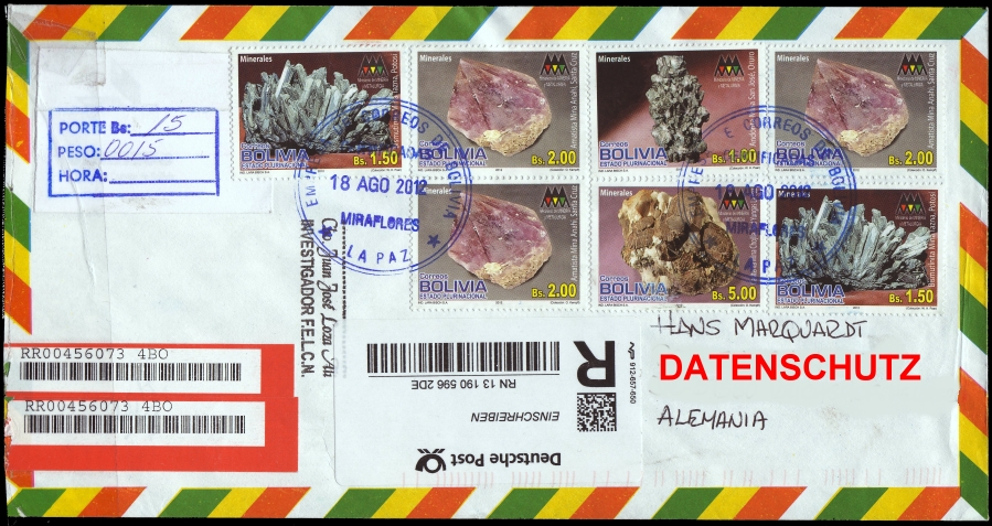 Weiterer, tatsächlich gelaufener Brief mit dem Satz Mineralien aus Bolivien Entwertet in La Paz-Miraflores, Bolivien 2012 |