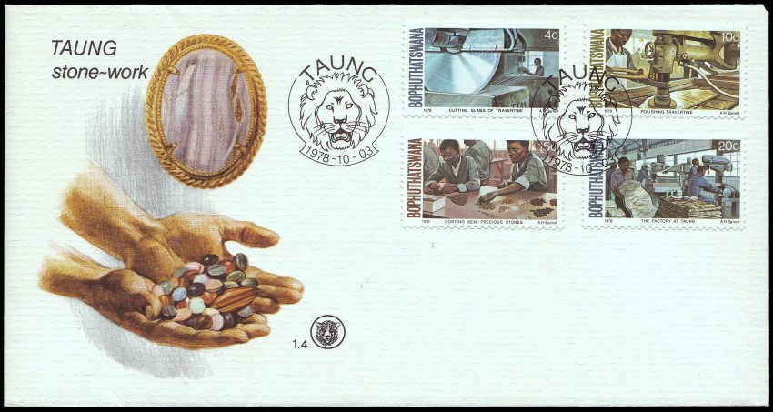 Ersttagsbrief - "Marmor- und Edelsteinindustrie - Steinverarbeitung in Taung" Der Brief ist mit einem Briefmarkensatz frankiert, von dem 3 Marken die Travertin-Verarbeitung (4c, 10c und 20c) und eine Marke die Sortierung / Auswahl von Halbedelsteinen zeigt. Das Umschlagmotiv zeigt zwei Hände mit verschiedenen Halbedelsteinen, sowie einen eingefassten, Chalcedon. Entwertet in Taung, Bophuthatswana - 1978 |