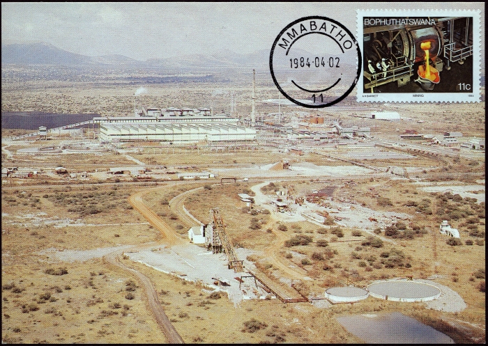 Maxi-Karte "Impala Platinum Mine" Die Maxi-Karte zeigt eine Luftaufnahme von Schachtanlage und Hüttenwerk der Impala Platin Mine in Rustenburg im Jahre 1984. Die Karte ist mit einer 11c Briefmarke von 1984 frankiert und hat als Motiv einen Schmelzvorgang im Hüttenwerk. Entwertet in Mmbatho, Bophuthatswana - 1984 |