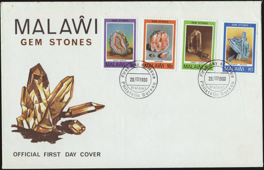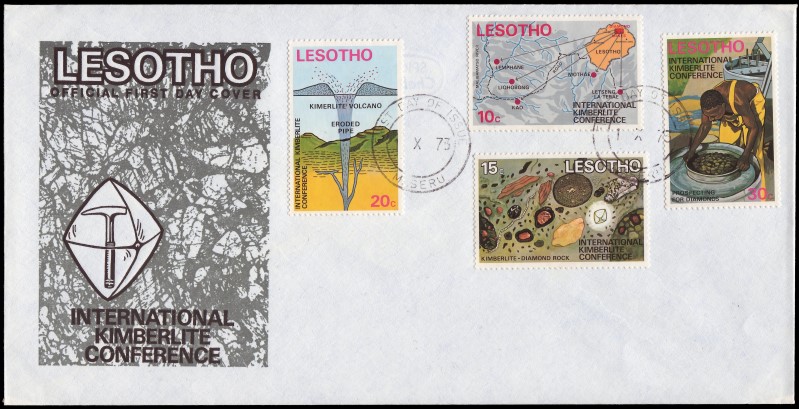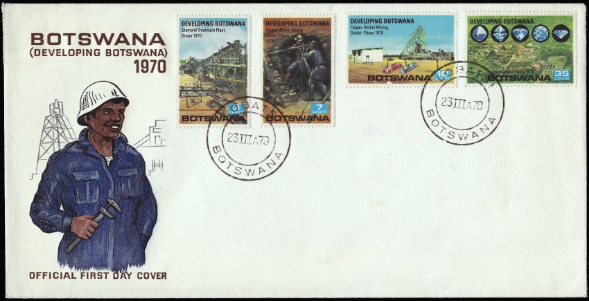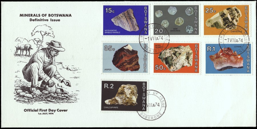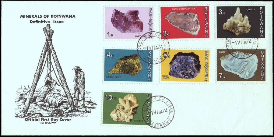 Ersttagsbrief I - "Mineralien aus Botswana" Auf den Briefmarken sind die Mineralien Amethyst (1c), Achat (2c), Quarz (3c), Kupfer-Nickel-Erz (4c), Moosachat (5c), Achat (7c) und Stilbit (10c) abgebildet. Auf dem Umschlag ein Motiv mit zwei Edelsteinschürfern mit einfachem Fördergerüst beim Abteufen eines Schachtes. Entwertet in Gaborone, Botswana - 1974 |
