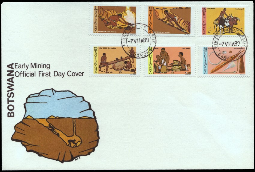 Ersttagsbrief - “Frühgeschichtlicher Bergbau in Botswana“ Die Motive der Marken zeigen das Feuersetzen (5), die Förderung der Erze (10), den Erztransport (15), ein primitives Pochwerk (20), die Verhüttung des Erzes (25), sowie hergestellte Werkzeuge und Gegenstände (35). Das Umschlagmotiv zeigt den frühgeschichtlichen Bergbau mit Abbauort, Förder- und Wetterschacht. Entwertet in Gaborone, Botswana - 1980 |