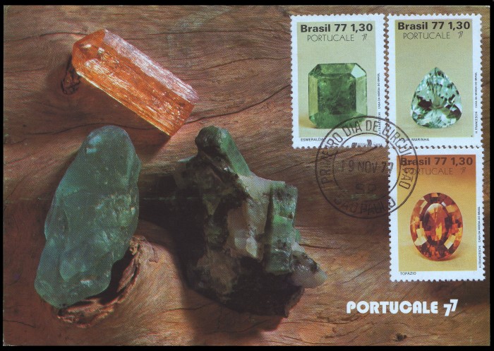 Maxikarte - "Edelsteine " zur Internationalen Thematik-Briefmarkenausstellung PORTUCALE 77 in Porto/Portugal Die Karte ist mit drei Briefmarken gleicher Werte frankiert und zeigt die Edelsteine Smaragd, Aquamarin und Topas in unterschiedlich geschliffenen Formen. Auf der Karte sind die gleichen Edelsteine in ihrer natürlichen Form abgebildet. Entwertet in Sao Paulo, Brasilien - 1977 |