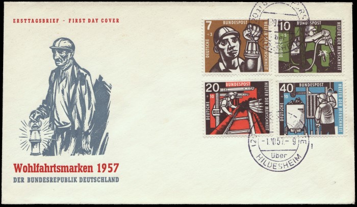 Ersttagsbrief - "Wohlfahrtsmarken - Helfer der Menschheit" Entwertet in Hildesheim, Bundesrepublik Deutschland - 1957Auf dem Briefmarkensatz sind Motive aus dem Steinkohlenbergbau abgebildet. Die 7 Pf Marke zeigt einen Bergmann mit elektrischer Grubenlampe, die 10 Pf Marke einen Bergmann mit Abbauhammer, die 20 Pf Marke einen Bergmann am Kohlenhobel und die 40 Pf Marke einen Bergmann (Anschläger) mit Lore am Füllort. Das Schmuckmotiv des Briefumschlages zeigt einen Bergmannmit mit elektrischer Grubenlampe. |