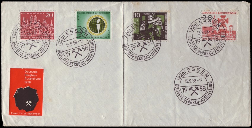 Frankierter und entwerteter Briefumschlag zur Deutschen Bergbau-Ausstellung 1958 in Essen Auf dem Umschlag ein selbstgefertigter Aufkleber und vier Briefmarken, davon eine Marke aus dem Wohlfahrtsmarkensatz Kohlebergbau von 1957. Die 10 Pf Marke zeigt einen Bergmann mit einem Abbauhammer. Im Postsonderstempel sind Eisen & Schlägel enthalten. Entwertet in Essen, Bundesrepublik Deutschland - 1958 |