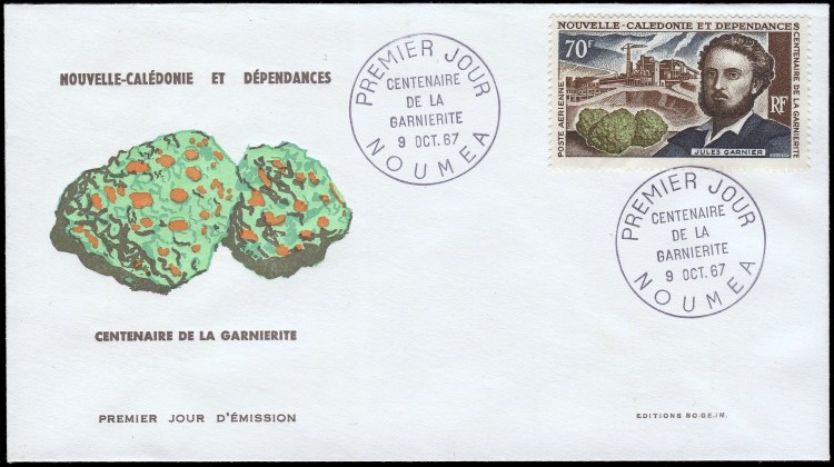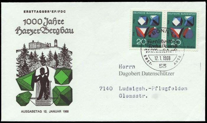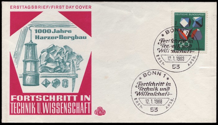 Ersttagsbrief - "Fortschritt in Technik und Wissenschaft" Einzige Briefmarke der "alten" Bundesrepublik Deutschland mit einem Motiv aus der Mineralogie. Abgebildet sind Kristallmodelle der Blei-Zink-Erze Galenit (PbS) und Sphalerit (ZnS) sowie ein Hinweis auf den tausendjährigen Harzer Bergbau. Das Umschlagmotiv zeigt Grubenlampe, Hacke, Erzstufe, Kristalle und die Andeutung eines Stollens. Entwertet in Bonn, Bundesrepublik Deutschland - 1968 |