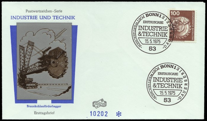 Ersttagsbrief - "Industrie und Technik" Teil eines Satz von 12 verschiedenen Motiven aus Industrie & Technik. Das Schmuckmotiv des Umschlages zeigt einen Braunkohlenförderbagger, auf der Briefmarke ist das Schaufelrad eines solchen Baggers abgebildet. Entwertet in Bonn, Bundesrepublik Deutschland - 1975 |