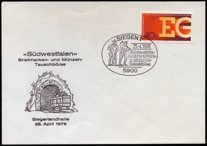 Abgebildet ist ein mit Erz beladener Grubenhunt vor einem Stolleneingang. Entwertet wurde die 40 Pf Briefmarke, die im Motiv als Stahlträger ausgebildete Großbuchstaben für die Europäische Gemeinschaft für Kohle und Stahl zeigt, durch einen Sonderstempel mit den Siegerländer Originalen Henner & Frieder. Entwertet in Siegen, Bundesrepublik Deutschland - 1976 |