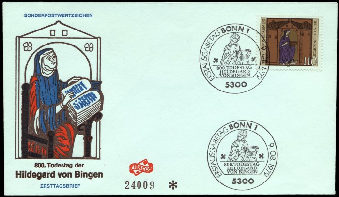 Ersttagsbrief - 800. Todestag der Hildegard von Bingen - U. a. erkannte Hildegard von Bingen im Mittelalter die Mystik der heilenden Kräfte der Edelsteine, Diamanten und Mineralien. Motive auf Umschlag, Briefmarke und Ersttagsstempel zeigen Hildegard von Bingen beim lesen der Schriften. Entwertet in Bonn, Bundesrepublik Deutschland - 1979 |