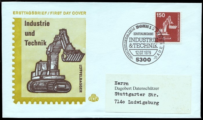 Echt gelaufener Ersttagsbrief - "Industrie und Technik" Teil eines Satz von 4 verschiedenen Motiven aus Industrie & Technik. Briefmarke und Schmuckmotiv des Umschlages zeigen einen Löffelbagger, wie er auch in Bergbau und Steinbruchbetrieben zum Einsatz kommt. Entwertet in Bonn, Bundesrepublik Deutschland - 1979 |