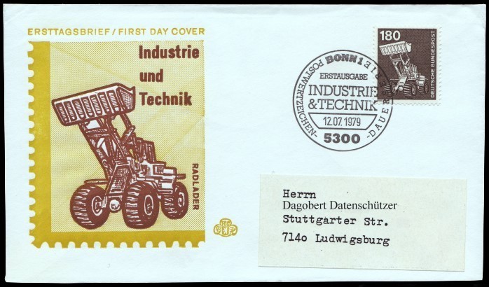 Echt gelaufener Ersttagsbrief - "Industrie und Technik" Teil eines Satz von 4 verschiedenen Motiven aus Industrie & Technik. Briefmarke und Schmuckmotiv des Umschlages zeigen einen Radlader, wie er auch in Bergbau und Steinbruchbetrieben zum Einsatz kommt. Entwertet in Bonn, Bundesrepublik Deutschland - 1979 |