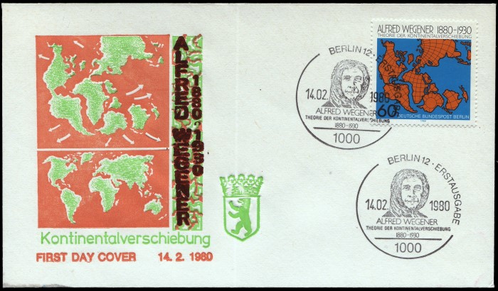 Ersttagsbrief - "100 Geburtstag von Alfred Wegener - Theorie der Kontinentalverschiebung" Umschlagmotiv und Briefmarke zeigen die Darstellung der Kontinentalverschiebung, der Ersttagsstempel enthält ein Konterfei von Alfred Wegener 1880 - 1930 Entwertet in West-Berlin, Bundesrepublik Deutschland - 1980 |