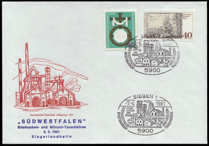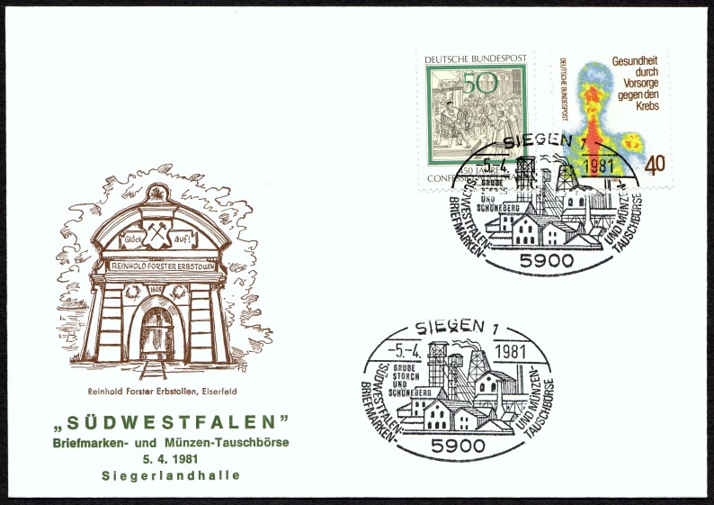 Weiterer, echt gelaufener regionaler Schmuckbrief zur gleichen Tauschbörse mit einem Motiv des Portals vom Reinhold-Forster-Erb- stollen (Besucherbergwerk) in Siegen-Eiserfeld. Entwertung der Briefmarke (ohne Bezug zum Bergbau) durch einen Sonder- stempel mit dem Motiv der Grube Storch und Schöneberg bei Gosenbach. Entwertet in Siegen, Bundesrepublik Deutschland - 1982 |