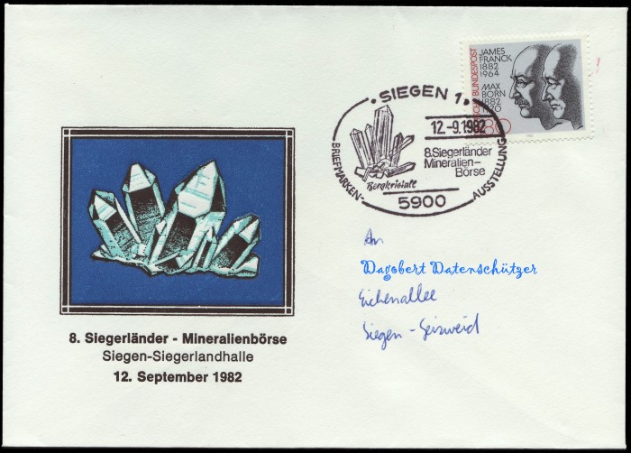 Echt gelaufener regionaler Schmuckbrief - "8. Siegerländer - Mineralienbörse" in Siegen Das Umschlagmotiv stellt eine Quarzkristallgruppe dar. Entwertet ist die Briefmarke durch einen Sonderstempel mit einem Bergkristall und dem Hinweis auf die Mineralien-Börse und eine Briefmarkenausstellung Entwertet in Siegen, Bundesrepublik Deutschland - 1982 |