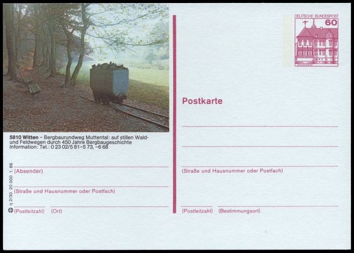 Regionale Postkarte (Ganzsache) von Witten mit dem Motiv einer Kohlenlore Bundesrepublik Deutschland - 1986 |