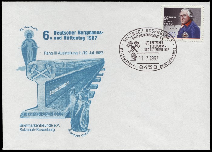 Regionaler Schmuckbrief - "6. Deutscher Bergmanns- und Hüttentag 1987" in Sulzbach-Rosenberg /Oberpfalz Das Umschlagmotiv zeigt eine Schiene mit Eisen & Schlägel, die Schutzheilige der Bergleute, die Heilige Barbara sowie den Erzengel Gabriel. Der Sonderstempel zeigt ebenfalls Eisen & Schlägel und eine Grubenlampe. Entwertet in Sulzbach-Rosenberg, Bundesrepublik Deutschland - 1987 |