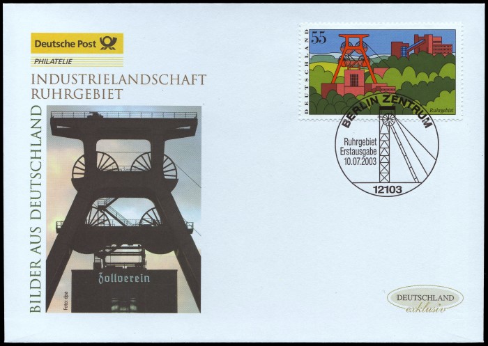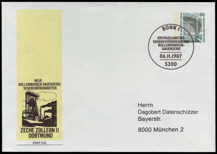 Echt gelaufener Ersttagsbrief - "Neue Rollenmarken - Dauerserie Sehenswürdigkeiten" Das Umschlagmotiv zeigt die Anlagen der Zeche Zollern II in Dortmund, die aufgedruckte Briefmarke das Hauptportal. Entwertet in Bonn, Bundesrepublik Deutschland - 1987 |