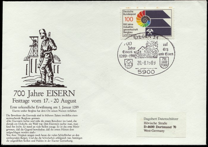 Echt gelaufener regionaler Schmuckbrief - "700 Jahre Eisern" Frankiert mit Marke 100 Jahre Industriegewerkschaft Bergbau und Energie, auf dem Umschlag ein Motiv Bergmann vor Bergwerksanlagen und entwertet durch einen Sonderstempel mit Bergbaumotiv.Entwertet in Siegen, Bundesrepublik Deutschland - 1989 |