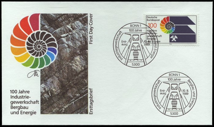 Ersttagsbrief - "100 Jahre Industriegewerkschaft Bergbau und Energie" Die Motive auf Briefmarke und Umschlag zeigen Ammonit, Steinkohleflöz, Eisen & Schlägel. Entwertet wurde die Marke Entwertet in Bonn, Bundesrepublik Deutschland - 1989durch einem Sonderstempel mit dem Förderturm (Doppelbock) der Zeche Zollverein in Essen. |