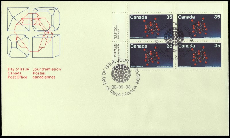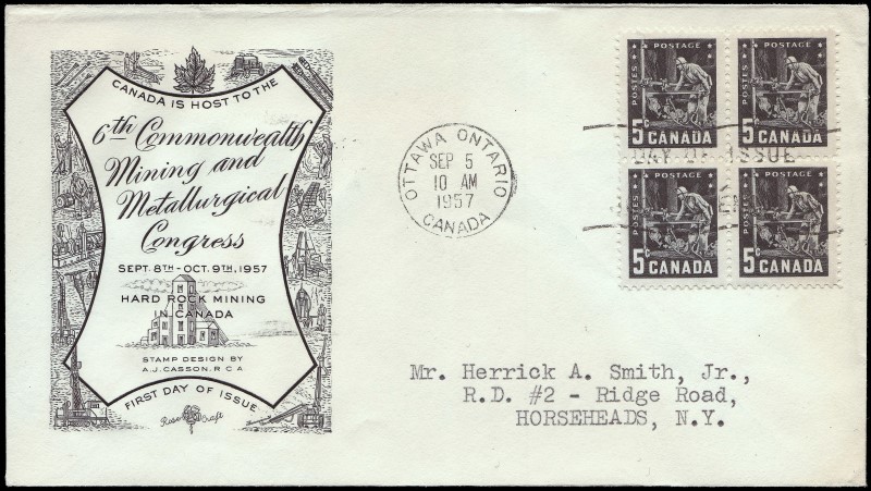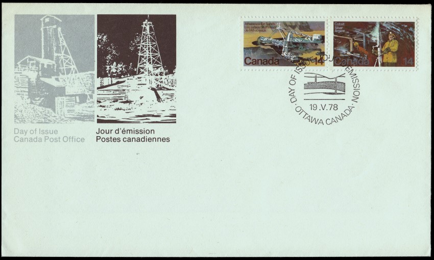 Ersttagsbrief - “Canadische Bodenschätze“ Der Briefumschlag ist frankiert mit 14c Marken welche als Motive Bergmänner bei Bohrarbeiten im Silber-Bergbau bei Cobalt, Ontario sowie einen Schaufelradbagger im Bitumensand-Tagebau im Athabasca-Tal, Alberta zeigen. Auf dem Umschlagmotiv sind negativ gedruckte Abbildungen eines Förderturms und eines Bohrturms zu sehen. Im Ersttagsstempel ist die Förderung der Bodenschätze schematisch dargestellt. Entwertet in Ottawa, Canada - 1978 |
