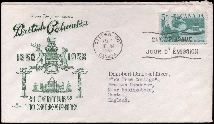 Echt gelaufener Ersttagsbrief - "100 Jahrfeier Britisch-Columbia" - Auf der 5c Briefmarke ist ein Goldsucher mit Waschpfanne am Fluß abgebildet. Im rechten Teil ein Wappen mit der Flagge. Das Schmuckmotiv des Briefumschlages zeigt neben dem Staatswappen von Britisch-Columbia indianische Entwertet in Ottawa, Canada - 1950Totempfähle sowie das Parlamentsgebäude. |