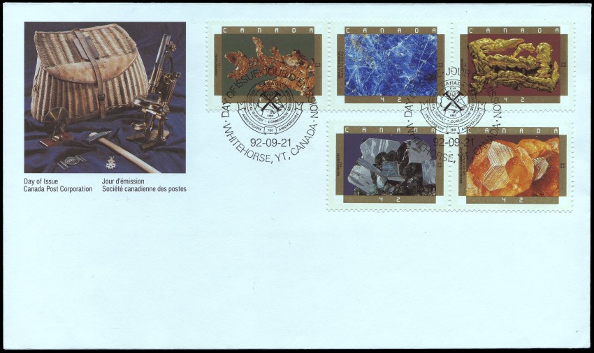 Ersttagsbrief - “Canadische Mineralien“ Die Motive auf den Briefmarken zeigen die Mineralien Gediegen Kupfer von Kamloops, Britisch Columbia; Sodalith von Bancroft, Ontario; Goldnugget von Hunker Creek, Yukon; Galenit aus der Polaris Mine, Little Cornwallis-Island und Grossular aus der Jeffrey Mine, Asbestos. Als Umschlagmotiv ist typisches Geologenwerkzeug und Gerät abgebildet. Im Postsonderstempel sind zwei gekreuzte Geologenhämmer vor einem Globus mit dem Umriss von Canada und die Inschrift "1842 –1992 - 150 Jahre Geologische Erkundung" enthalten. Entwertet in Whitehorse, Canada - 1992 |