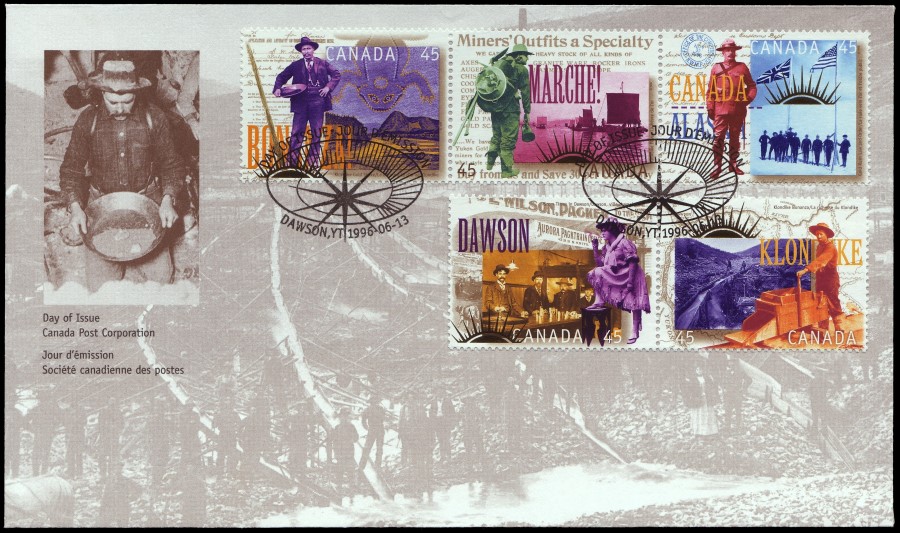 Ersttagsbrief - "Goldentdeckung am Yukon 1896 - 1996" - Klondike Goldrausch Die erste Marke zeigt Skookum Jim Mason, den Entdecker der Goldvorkommen. Mit der Waschpfanne in der Hand steht er vor dem Dokument über die Schürfrechte am Bonanza Creek und der stilisierten Zeichnung eines Frosches. Die zweite Marke zeigt einen Goldsucher mit einem kleinen Teil der Ausrüstung auf dem Landweg, sowie Segelboote auf dem Lake Laberge. Die dritte Marke zeigt einen kanadischen Mountie - Superintendent Sam Steel – Er steht vor einer Gruppe von Mounted Police Offizieren an der Yukon-Alaska Grenze und ist eine Hommage an alle Offiziere, die weder gekauft noch eingeschüchtert werden konnten. Die vierte Marke erinnert an Dawson-City, eine Goldgräberstadt, welche sich innerhalb kürzester Zeit zur größten und vielleichtunterhaltsamsten canadischen Stadt westlich von Winnipeg entwickelte. Hier fanden die Goldsucher Abwechslung beim Kartenspiel und anderweitigem Amüsement. Die letzte Marke zeigt zwei unterschiedliche Methoden der Goldgewinnung. Im Vordergrund ein Schürfer mit einer Rockerbox, im Hintergrund über einer Karte von Yukon, Goldsucher welche das Gestein über ein Schleusensystem auf Gold durchsuchen. Auf dem Umschlag sind weitere Goldgräbermotive zu sehen. Der Ersttagsstempel soll wahrscheinlich eine Waschpfanne darstellen. Entwertet in Dawson, Canada - 1996 |