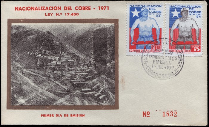 Ersttagsbrief - "Verstaatlichung der chilenischen Kupfer-Minen" Das Umschlagmotiv zeigt Bergwerksanlagen, die Briefmarken einen Bergmann mit Helm und elektrischer Kopflampe, welcher einen schweren Kupferbarren trägt. Im Hintergrund ist die chilenische Flagge abgebildet. Der Postsonderstempel enthält ebenfalls einen Kupferbarren. Chile - 1971 |