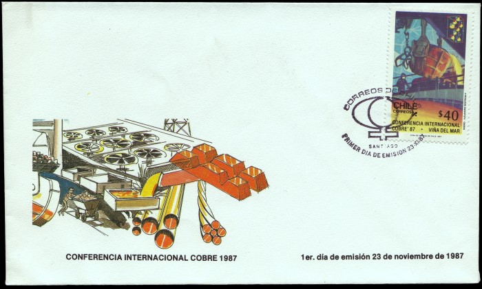 Ersttagsbrief - "Internationale Kupfer-Konferenz" in Vina del Mar / Chile Das Motiv der Briefmarke zeigt einen Schmelzkübel in der Kupferaufbereitung. Das Umschlagmotiv zeigt Darstellungen aus der Kupferaufbereitung sowie typische Produkte aus Kupfer, im Postsonderstempel das Symbol des Kupfers aus der Alchemie. Chile - 1987 |