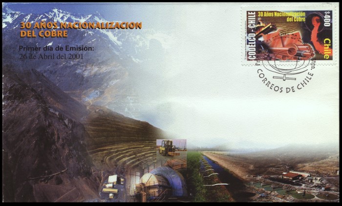 Ersttagsbrief - "30 Jahre Verstaatlichung der Kupfer-Minen" Auf der $400 Briefmarke sind mehrere Motive zum Thema Kupfer abgebildet. Zu sehen sind Tagebauanlagen mit Fördergeräten, Schmelzkübel sowie diverse Fertigprodukte aus Kupfer. Der Briefumschlag zeigt Motive von gewaltigen Tagebauanlagen vor dem Hintergrund der Anden, sowie Anlagen der Kupferaufbereitung, im Postsonderstempel das Symbol des Kupfers aus der Alchemie. Chile - 2001 |