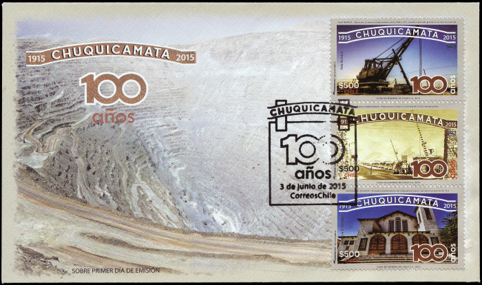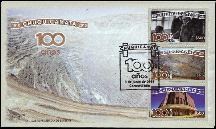 Ersttagsbrief - 100 Jahre Chuquicamata 1915 - 2015 Der Ersttagsbrief ist frankiert mit drei $500 Briefmarken aus dem gleichnamigen Satz. Die Motive der Marken zeigen den chilenischen Präsidenten 1915 beim Startschuss zum Abbau der Lagerstätte, eine Ansicht der Kupfermine mit dem weltgrößten Tagebau und das 1943 eröffnete Theater auf dem Minengelände. Rechts auf dem Umschlag ist der Tagebau sowie der Ausgabeanlass abgebildet. Im Postsonderstempel ist das Minen-Emblem und der Ausgabeanlass enthalten. Chile - 2015 |