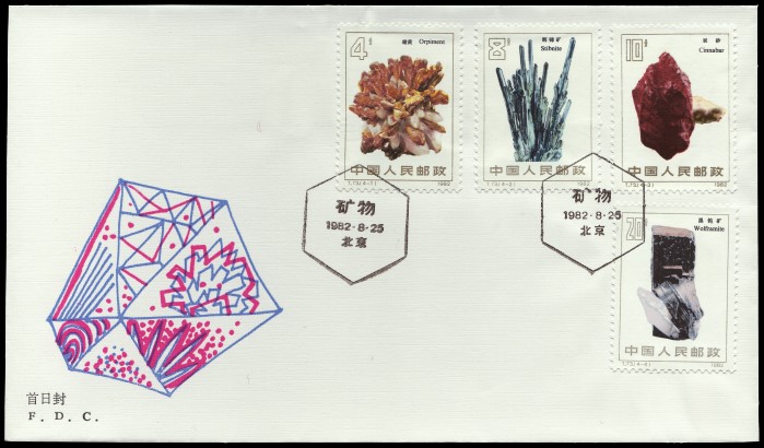 Ersttagsbrief - "Mineralien aus der Volksrepublik China" Auf den Briefmarken abgebildet sind die Mineralien 4 Auripigment, 8 Stibnit, 10 Cinnabarit und 20 Wolframit. Volksrepublik China - 1982 |
