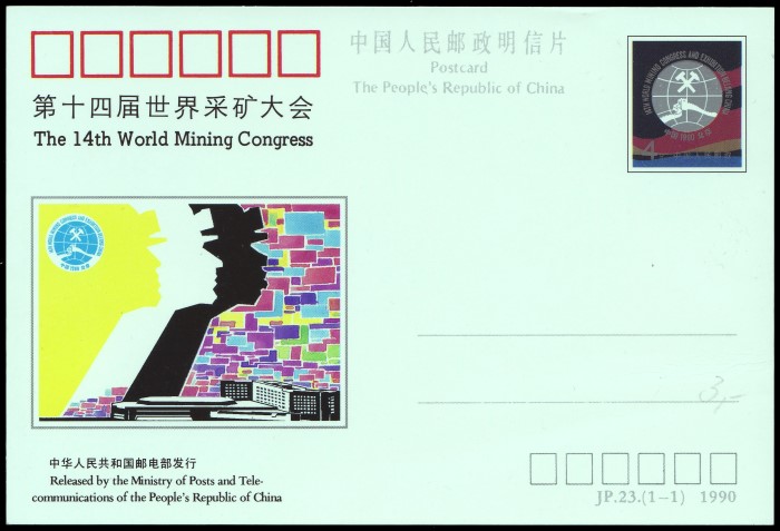 Schmuckpostkarte zum "14. Weltbergbaukongress 1990" in Peking Auf der aufgedruckten 4 CNY Briefmarke sind ein Globus mit der chinesischen Mauer, sowie Eisen & Schlägel abgebildet. Das Schmuckmotiv der Karte zeigt die gleiche Abbildung verkleinert mit der Silhouette von drei verschiedenfarbigen Bergleuten und einen Gebäudekomplex, vermutlich das Ministerium. Volksrepublik China - 1990 |