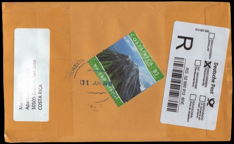 Rückansicht eines echt gelaufenen Einschreibebriefes von Costa Rica nach Deutschland Der Umschlag ist auf der Rückseite zusätzlich mit einer 85 Col Marke aus dem Jahr 2004 frankiert, welche den Vulkan Arenal zeigt. Costa Rica - 2012 |