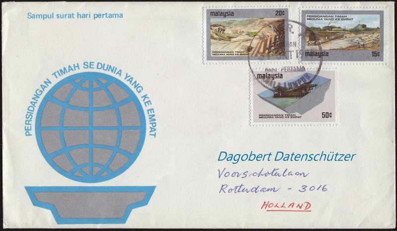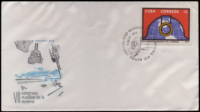 Ersttagsbrief - "8. Weltbergbaukongress 1974" Auf der Briefmarke abgebildet ein Schutzhelm mit elektrischer Kopflampe. Im Postsonderstempel sind Hafenanlagen, auf dem Umschlagmotiv Industrieanlagen dargestellt.Entwertet in Havanna, Cuba - 1974 |